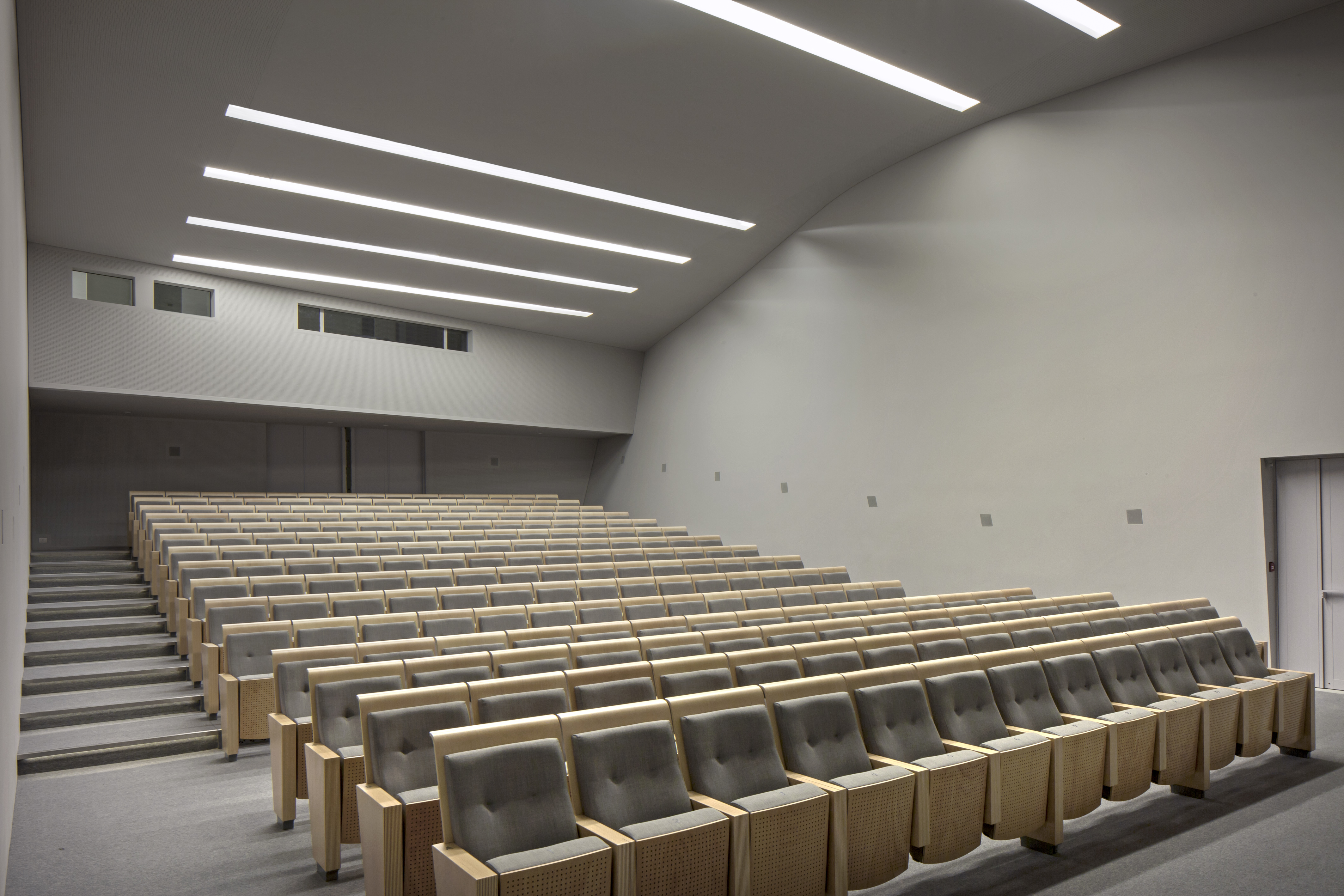 The Teatrino is spread over two large areas: a 225-seat auditorium and a foyer characterized by large triangular-shaped openings on the walls and a triangular skylight that illuminates the environment. The project is a tribute to the triangular shape, it amazes, generates a sense of movement, reflects the varied cultural programming it offers.